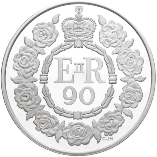 Crowned Royal Cypher above 90, encircled by nine roses.