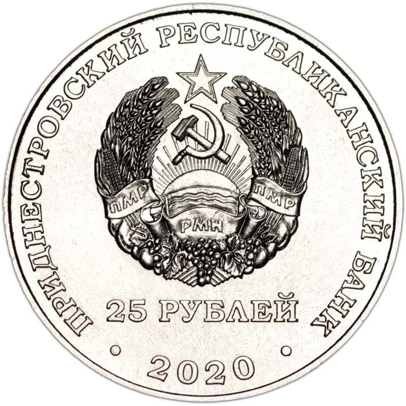 State Emblem of Transnistria. Circular inscription: top - "ПРИДНЕСТРОВСКИЙ РЕСПУБЛИКАНСКИЙ БАНК" (Transdniestrian Republican Bank), bottom - "25 РУБЛЕЙ" (25 Roubles). Below the emblem, the year "2020".