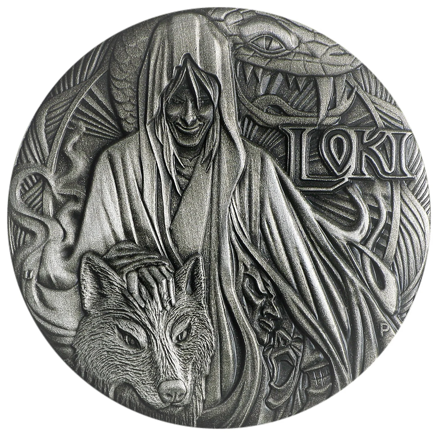 Loki smiles from within an oversized coat, stroking his wolf amid Scandinavian decorative motifs.