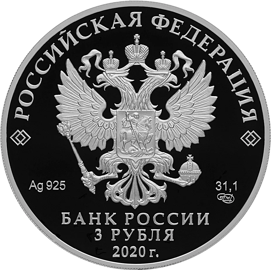 The obverse features the Russian Federation coat of arms with the inscription "РОССИЙСКАЯ ФЕДЕРАЦИЯ" above. Below are the metal specifications and mint mark, with "БАНК РОССИИ", "3 РУБЛЯ", and "2020 г." at the bottom.