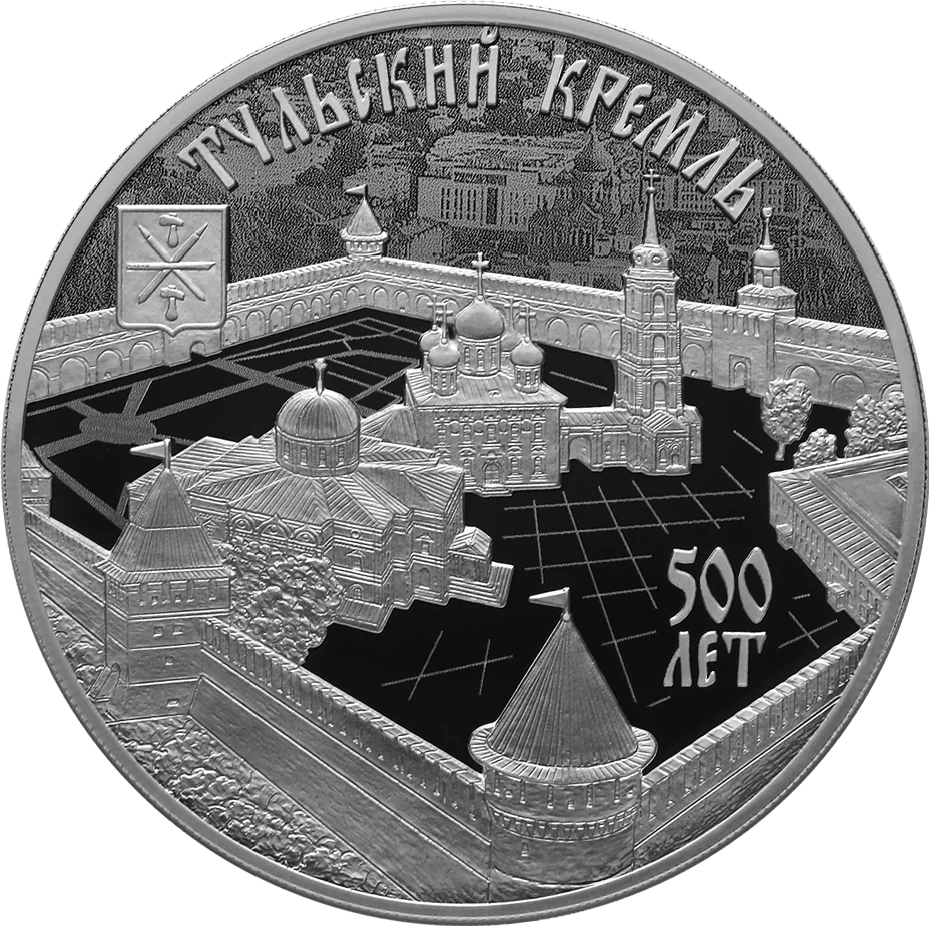 A relief of the Tula Kremlin against a city panorama; the Tula emblem is at top left. Around the rim: 'ТУЛЬСКИЙ КРЕМЛЬ' above and '500 ЛЕТ' at bottom right.