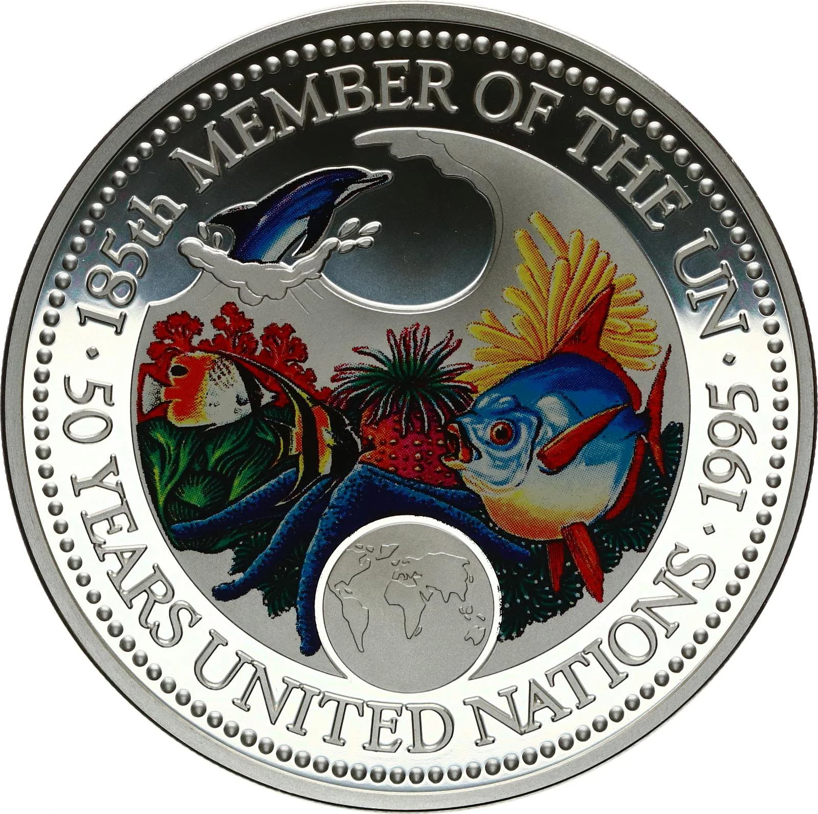 Multicolored ocean scene with fish, dolphin, coral, and a UN emblem.