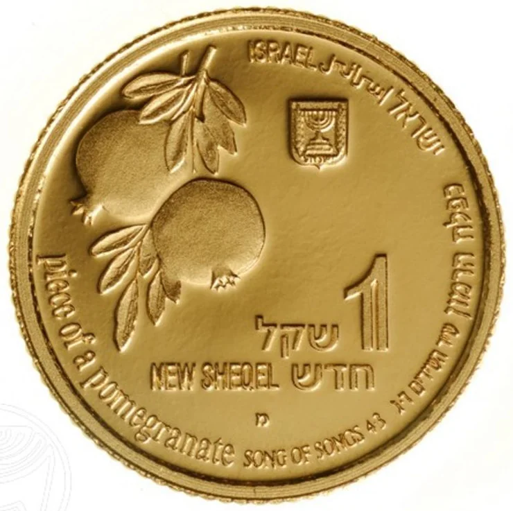 Israeli coin featuring pomegranates, the state emblem, "Israel" in three languages, and a border inscription quoting Song of Songs 4:3.