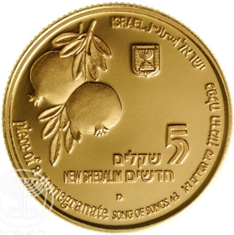 Israeli coin featuring pomegranates, the state emblem, "Israel" in three languages, and a border inscription quoting Song of Songs 4:3.