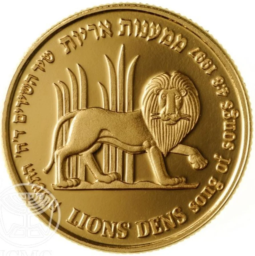 A lion amid border flora, with the Hebrew and English inscription “LIONS’ DENS, Song of Songs 4:8” and the mint year.