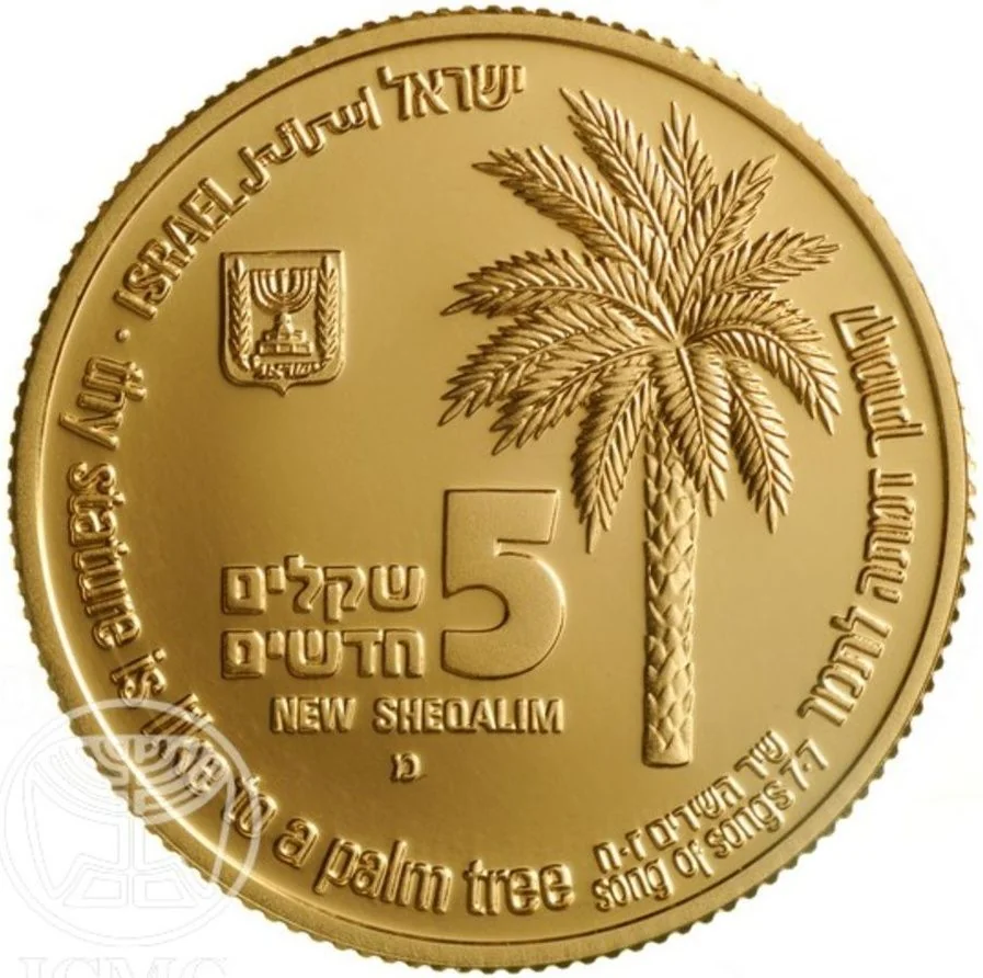 Hebrew and English face value, date palm, Israel State Emblem, "ISRAEL" in three languages, and the verse "thy stature is like to a palm tree" (Song of Songs 7:7).