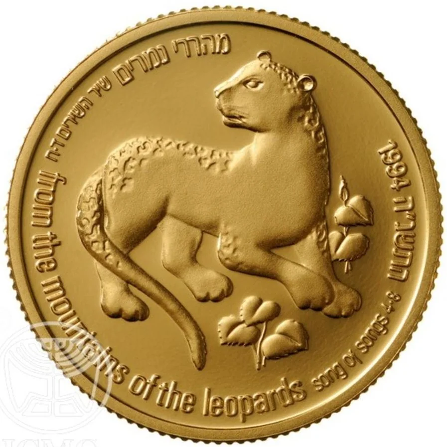 A leopard encircled by the border text: "from the mountains of the leopards" (Song of Songs 4:8) in Hebrew and English. Mint year 1994 / 5755.