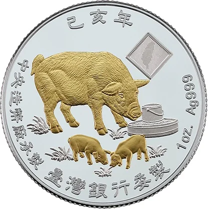 Description: A sow grazes as her piglets play nearby. Tilting the coin reveals Taiwan’s outline and Mount Yu within a rhombic latent image.