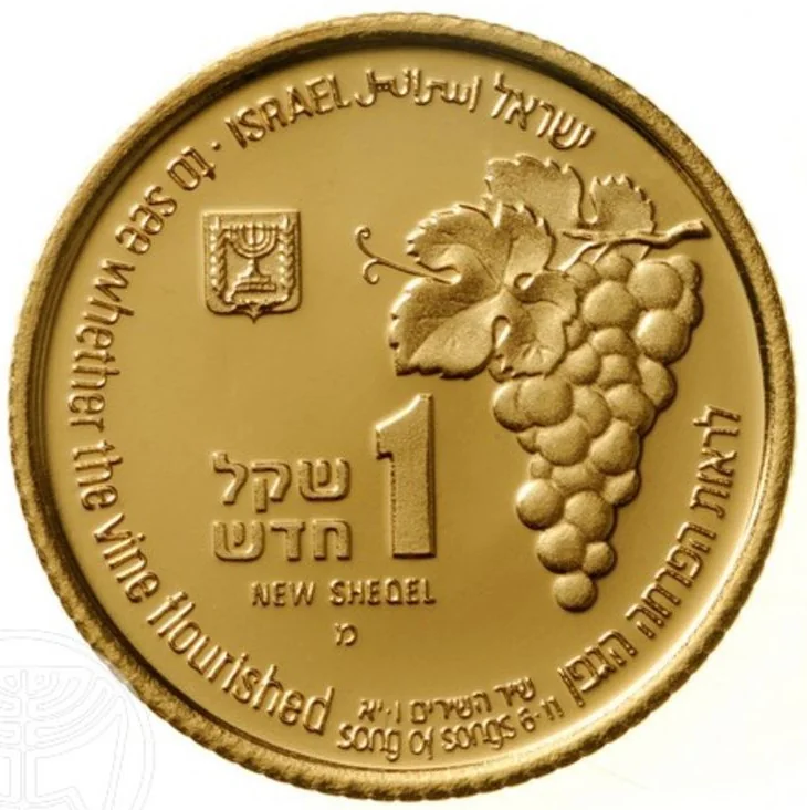 Border: "ISRAEL" in Hebrew, Arabic, and English with the verse "to see whether the vine flourished" (Song of Songs 6:11) in Hebrew and English.