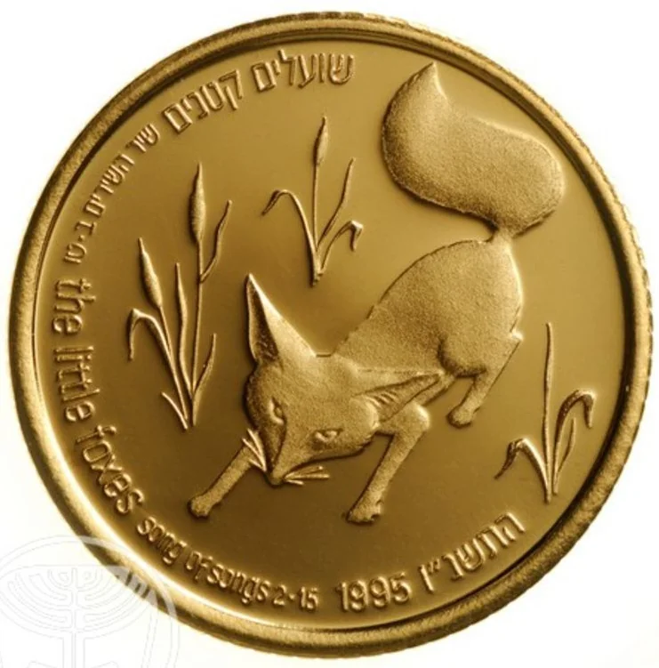 A pouncing Israeli fox. Border text: "the little foxes" with Hebrew and English citation "Song of Songs 2:15" and mint year "1995 / 5756".