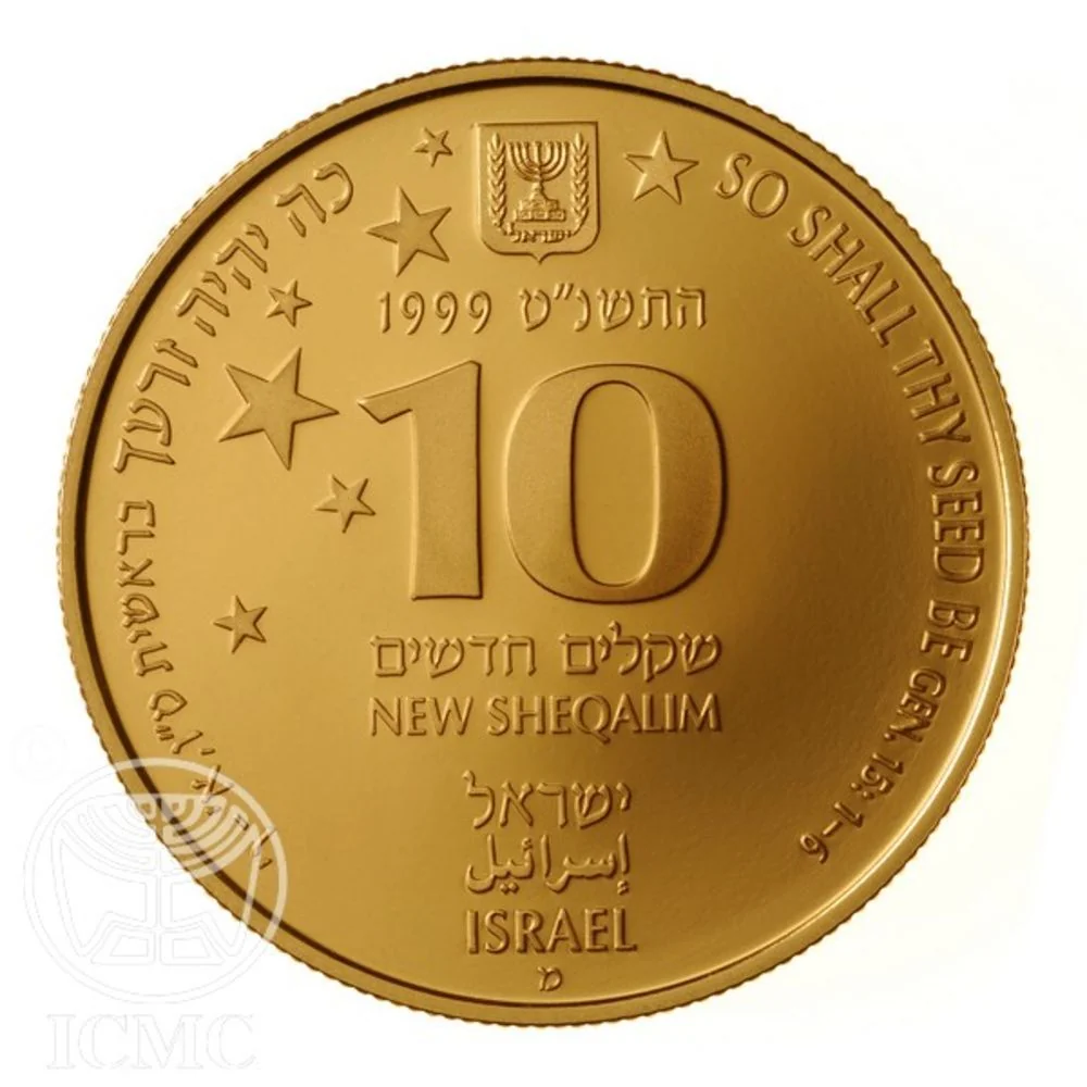 Seven stars, Israel's emblem, "Israel" in three languages, face value, mint year, and the inscription "SO SHALL THY SEED BE - GEN. 15:5" in Hebrew and English.