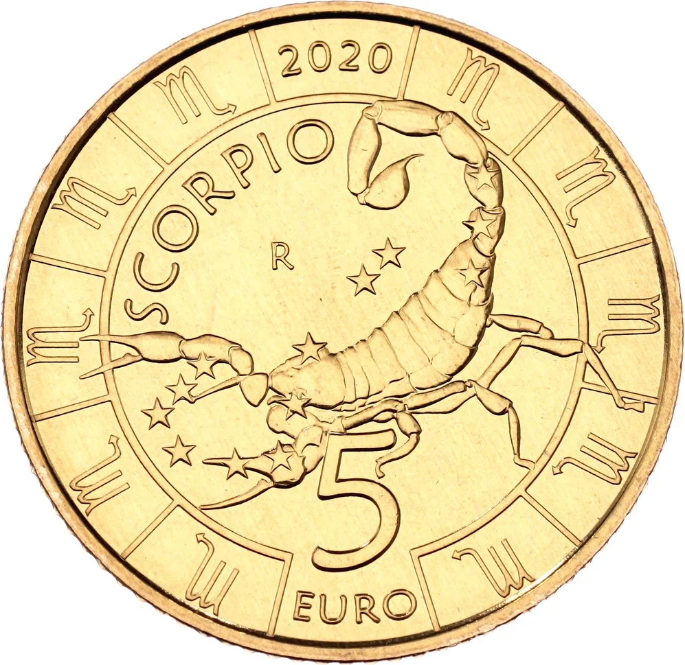 The reverse centers on a stylized Scorpio symbol, surrounded by ten astrological signs. The minting year is at the top and the "5 euro" face value is at the bottom.