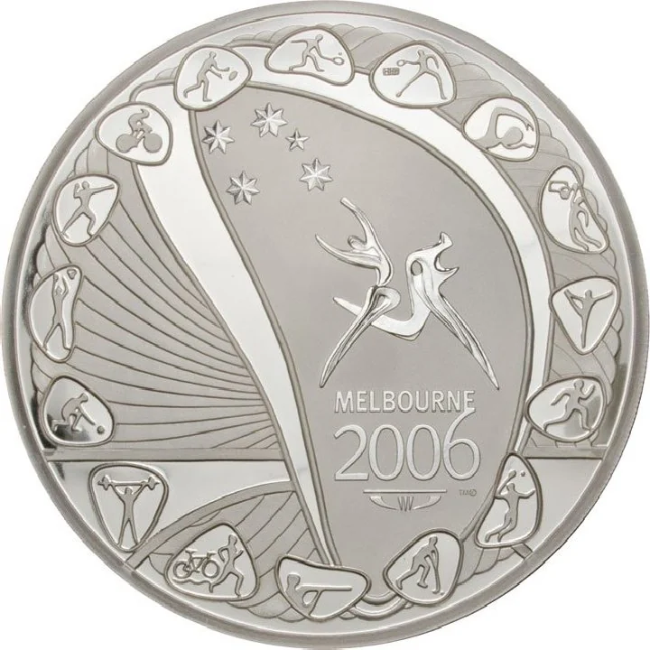 Melbourne Commonwealth Games logo centered, with the Southern Cross above and sixteen sports depicted around it.