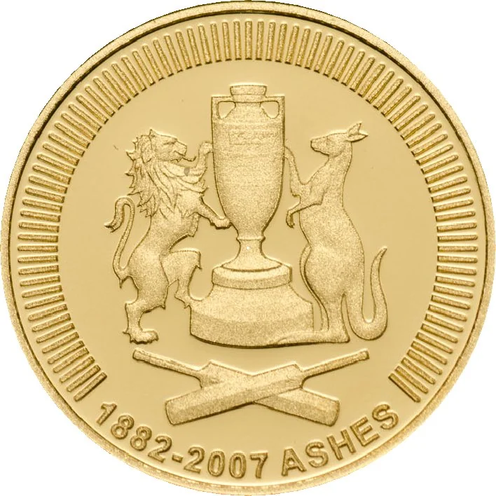 Mock coat of arms: lion and kangaroo flanking an Ashes urn, with crossed cricket bats below.
