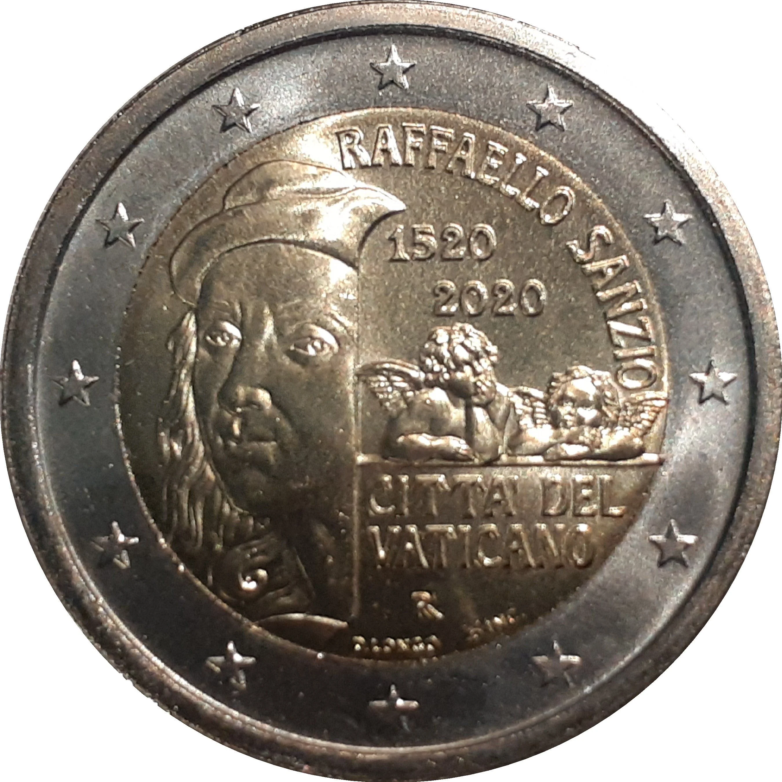 Description: The design features Raphael's portrait with two angels, the inscription 'RAFFAELLO SANZIO', the years '1520' and '2020', and 'CITTA' DEL VATICANO'. Below are the mintmark 'R' and artist 'D. LONGO'. The outer ring has the 12 European stars.