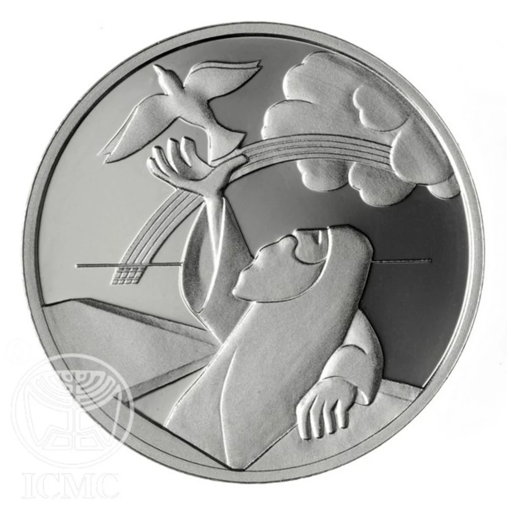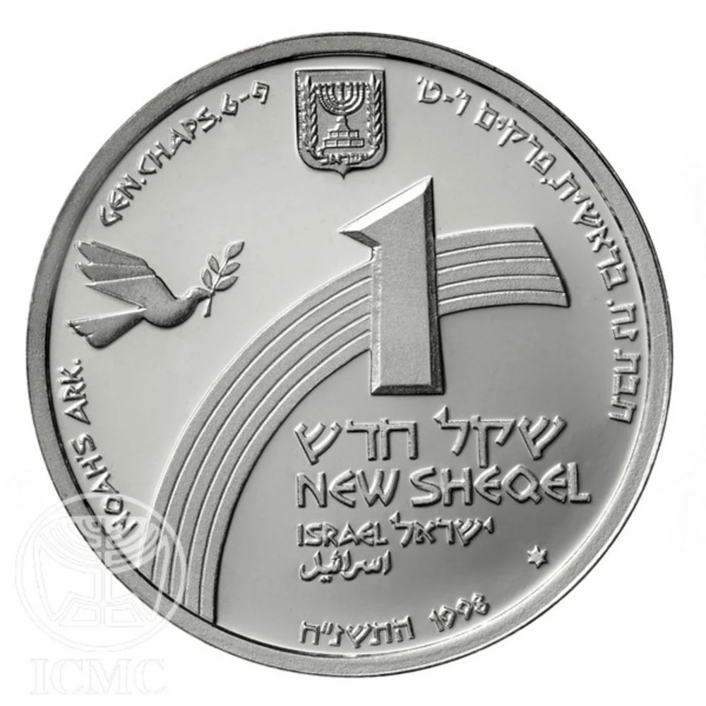 Face value on rainbow background; dove with olive branch; State Emblem; "Israel" in three languages; "NOAH'S ARK GEN. CHAPS 6-9" in Hebrew and English; mint year.