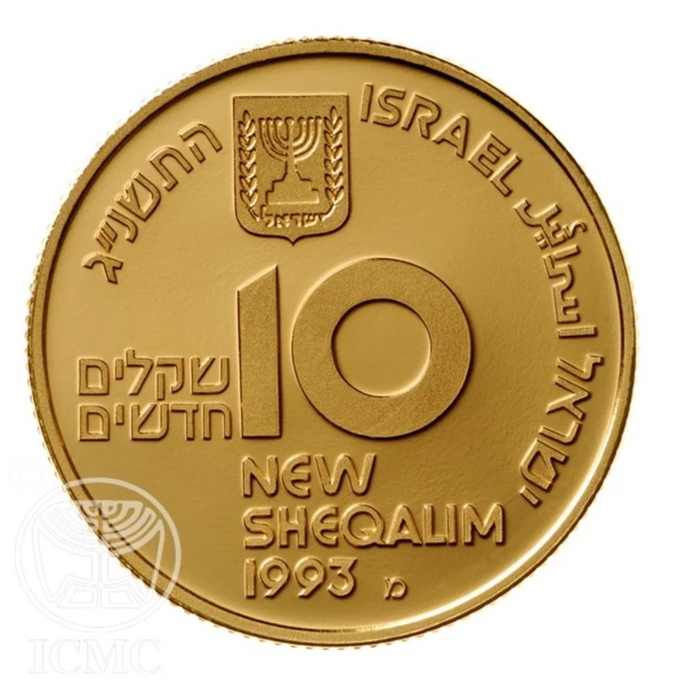 Face value in Hebrew and English. Below is the mint year 1993. Above, the Israel State Emblem is flanked by the Hebrew year 5753 and "ISRAEL" in Hebrew, Arabic, and English.