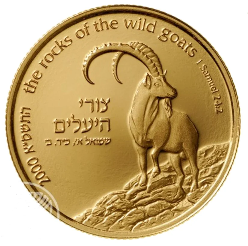 A mountain goat on a rocky cliff, framed by the verse "the rocks of the wild goats" (I Samuel 24:2) in Hebrew and English, and the mint year.