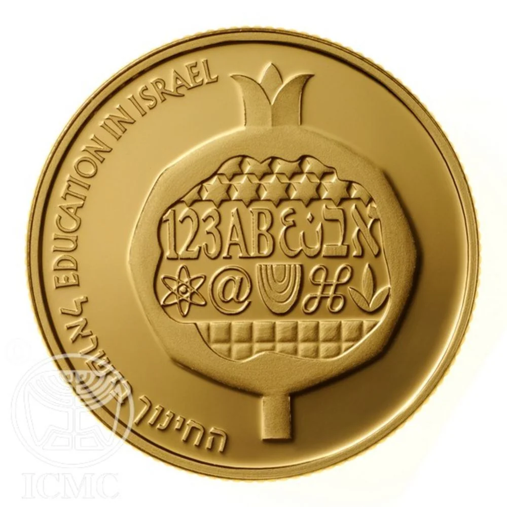 Description: The pomegranate, symbolizing a person "full as a pomegranate" with knowledge, contains: Stars of David for Jewish values and history; the letters A, B and digits 1, 2, 3 for foundational studies; and icons of agriculture, computers, archaeology, communications, and science for Israel's educational excellence. The border is inscribed with "EDUCATION IN ISRAEL" in Hebrew and English.