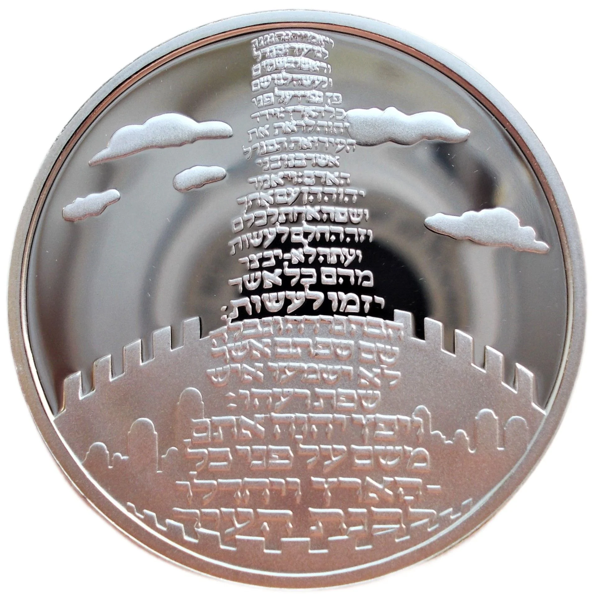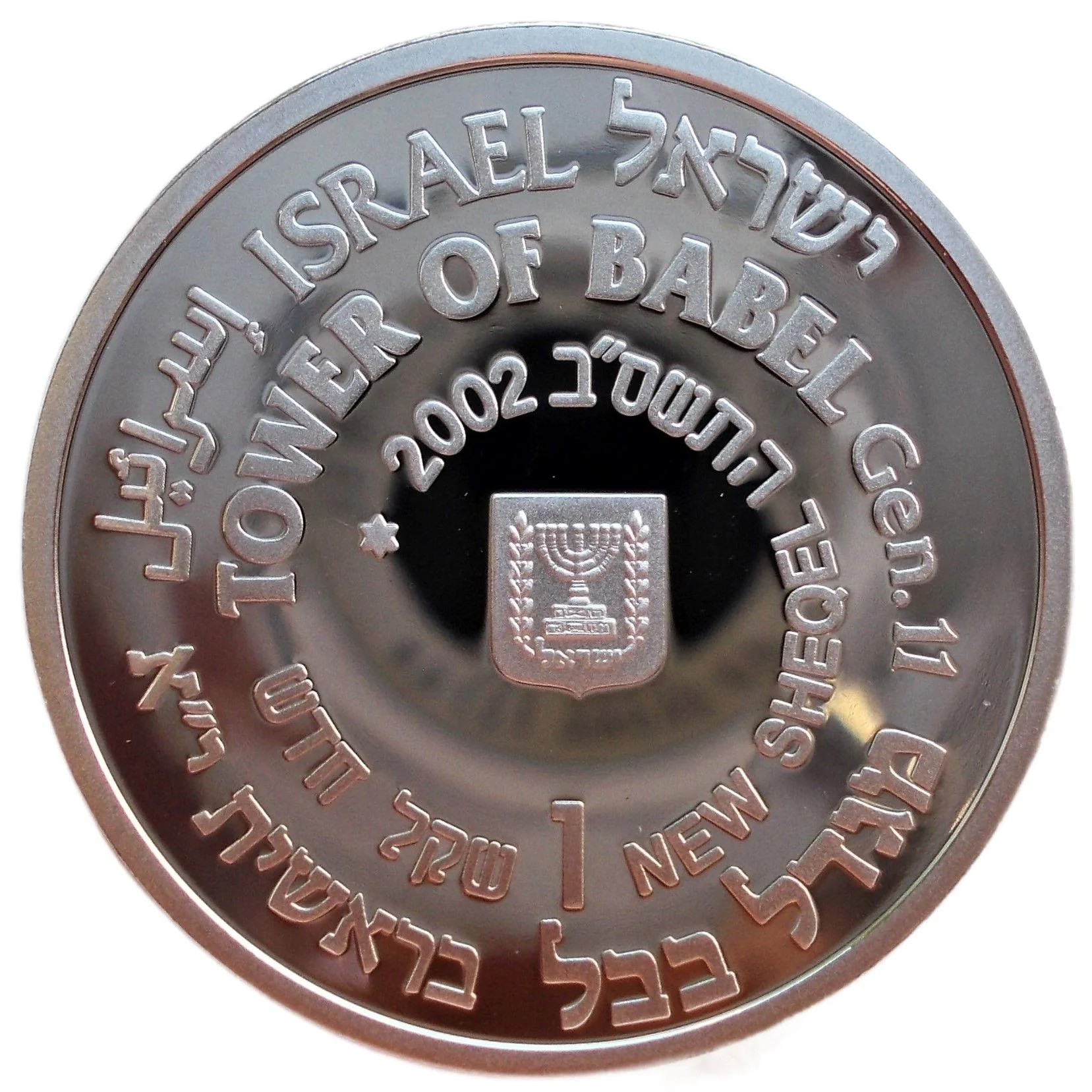 Spiral inscriptions of the face value, "Israel," and "TOWER OF BABEL GEN.11" in Hebrew, English, and Arabic create a top-down view. The Israel State Emblem is centered.