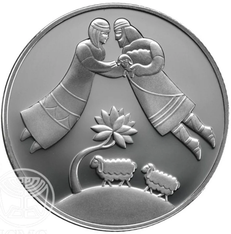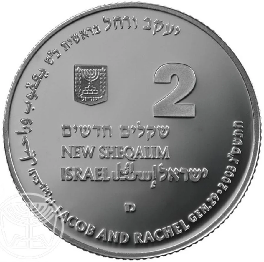 Israeli emblem and name in Hebrew, Arabic, and English; face value, mint year, and "JACOB AND RACHEL GEN.29" in Hebrew and English.