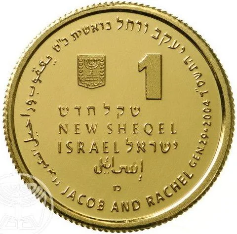 Israeli emblem and name in Hebrew, Arabic, and English; face value, mint year, and "JACOB AND RACHEL GEN.29" in Hebrew and English.