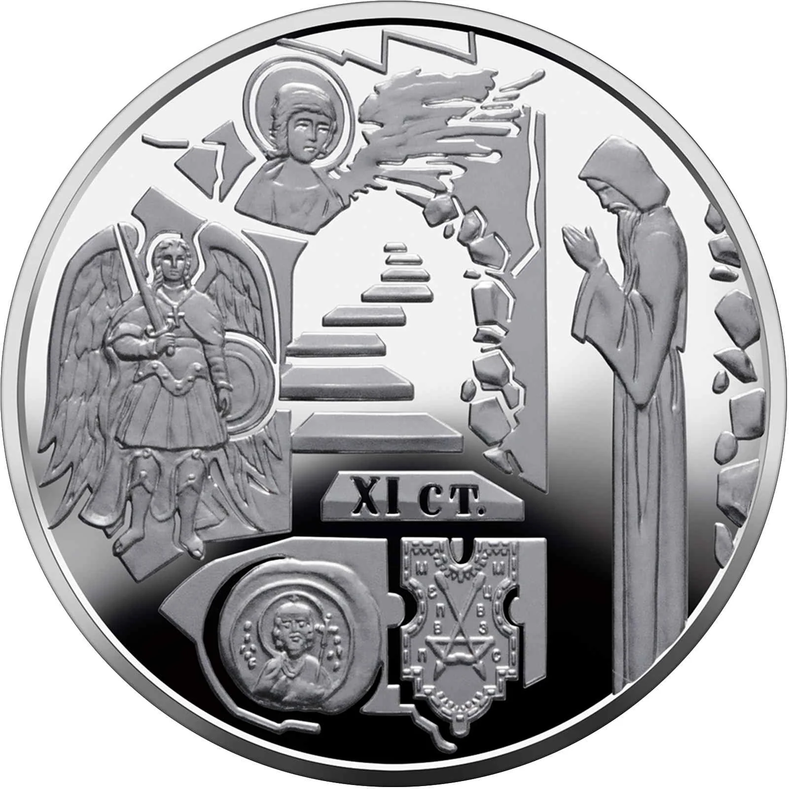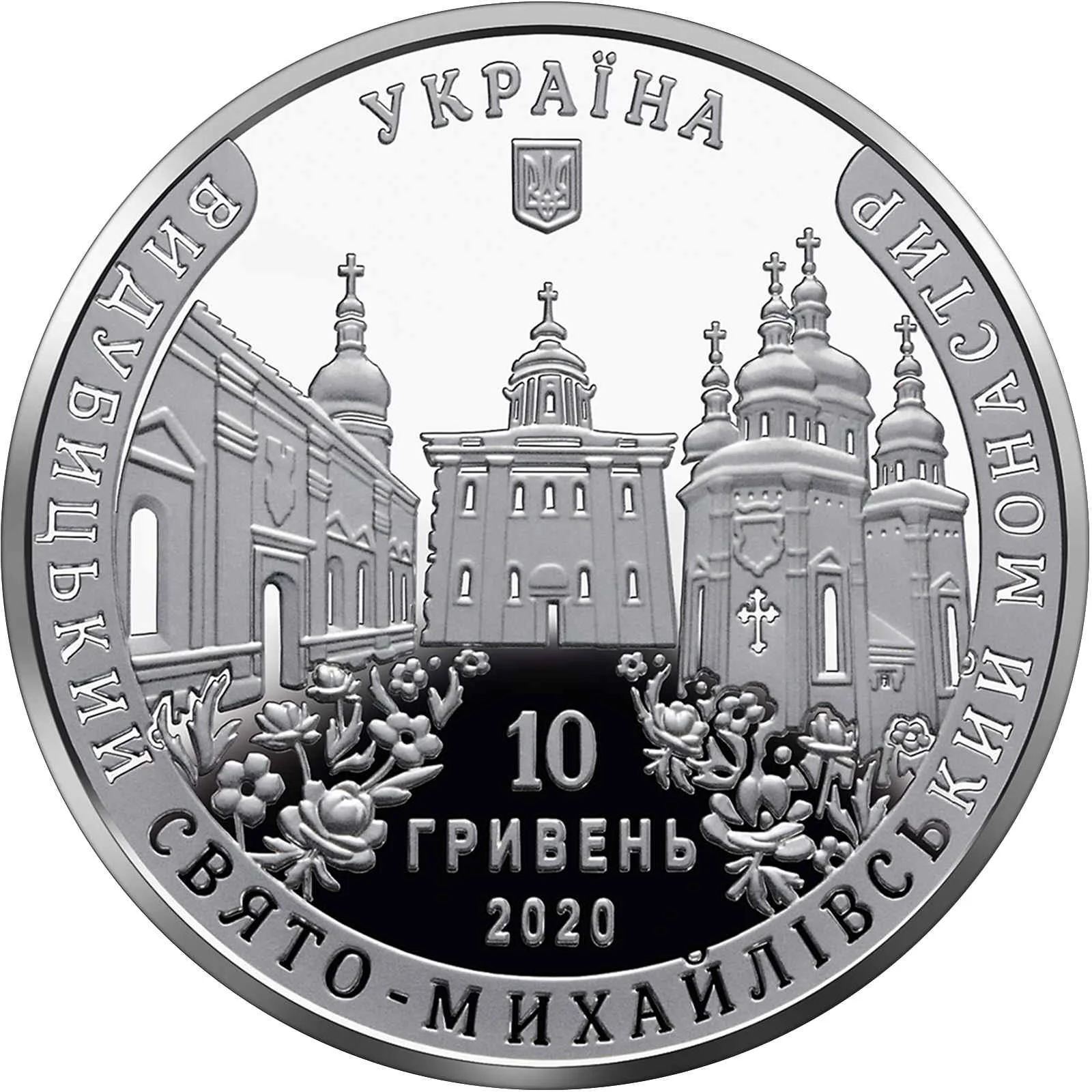 The obverse features Ukraine's small coat of arms and the inscription "УКРАЇНА." The center depicts buildings of the Vydubychi Monastery with the inscriptions "10 ГРИВЕНЬ 2020" and "ВИДУБИЦЬКИЙ СВЯТО-МИХАЙЛІВСЬКИЙ МОНАСТИР."