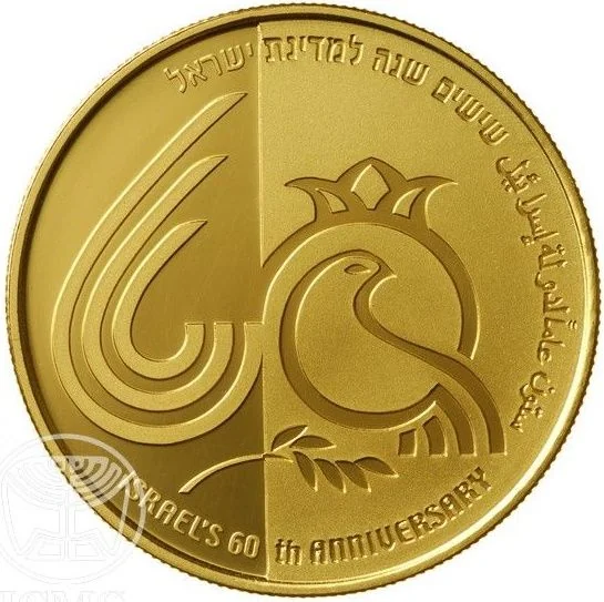 A stylized 60: the "6" curves upward, while the "0" is a crowned pomegranate (symbolizing prosperity) containing a dove with an olive branch (for peace). Inscription: "Israel's 60th Anniversary" in Hebrew, English, and Arabic. Shiny and frosted finishes highlight the design.