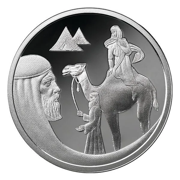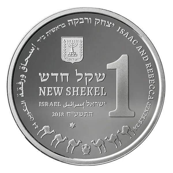 Face value, Israel's emblem, "Israel" in English, Hebrew, and Arabic, mint year and mark. "Isaac and Rebecca" inscribed in three languages around the lower border, with decorative camels and a water jug.