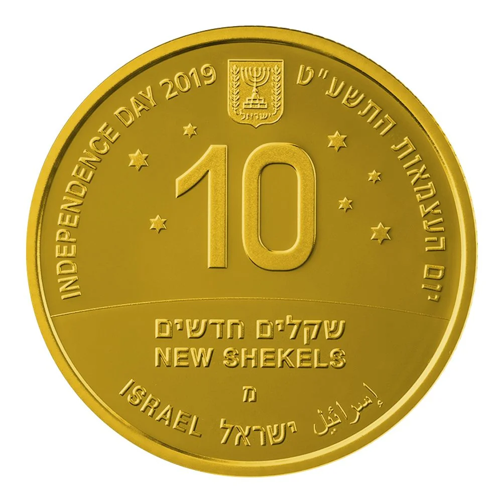 Featuring "Israel" in English, Hebrew, and Arabic, "Independence Day 2019," and the face value. Seven stars mark seven decades, while the horizon symbolizes Israel's limitless innovative achievements.