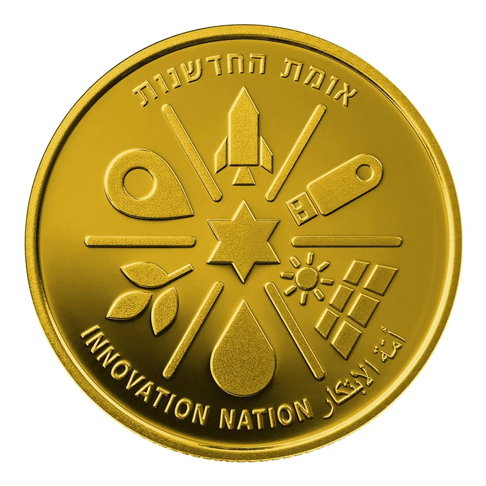 Six symbols represent Israeli innovations: a rocket (space), a USB drive (data storage), a solar panel (solar energy), a water droplet (water tech), three leaves (agritech), and a car navigation symbol. Border text: "Innovation Nation" in English, Hebrew, and Arabic.