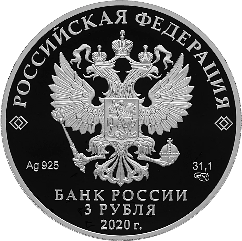 The obverse features the Russian Federation coat of arms with the inscription "РОССИЙСКАЯ ФЕДЕРАЦИЯ" above. Below are the metal specifications and mint mark, with "БАНК РОССИИ", "3 РУБЛЯ", and "2020 г." at the bottom.