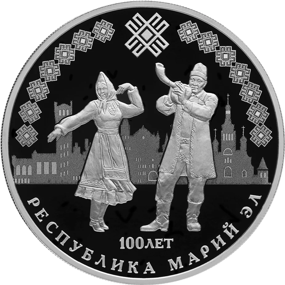 The disc features a relief of a Mari bagpiper in national costume and a woman dancing against a stylized cityscape. A traditional Mari ornament runs along the top rim, with "РЕСПУБЛИКА МАРИЙ ЭЛ" and "100 ЛЕТ" inscribed below.