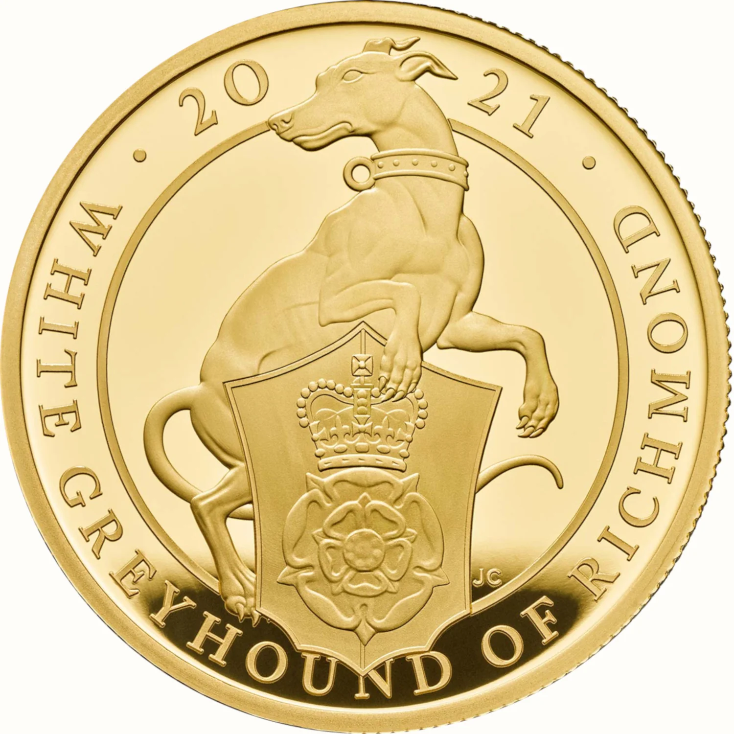 White Greyhound of Richmond with heraldic badge, encircled by legend.
