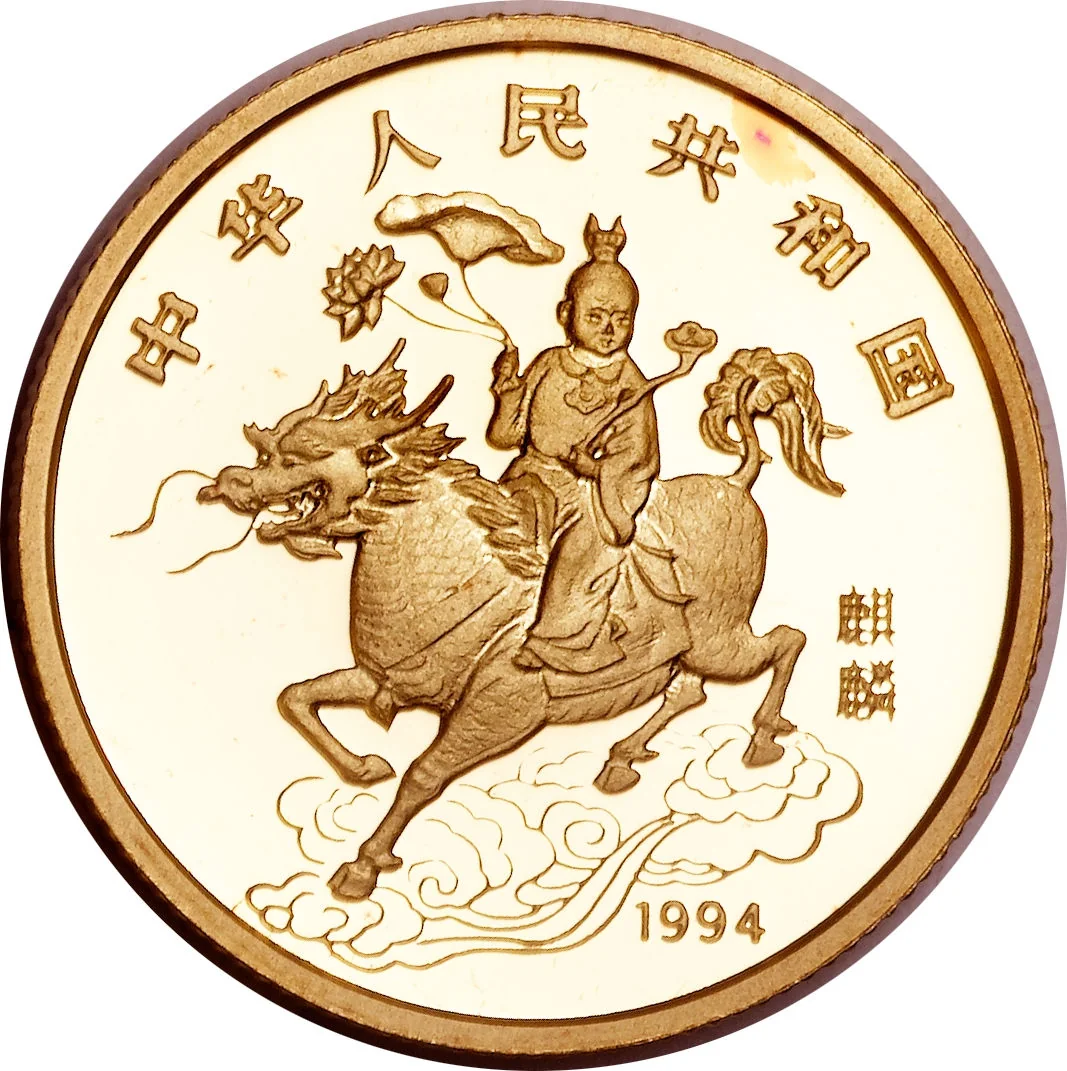 Eastern unicorn figure, dated below.