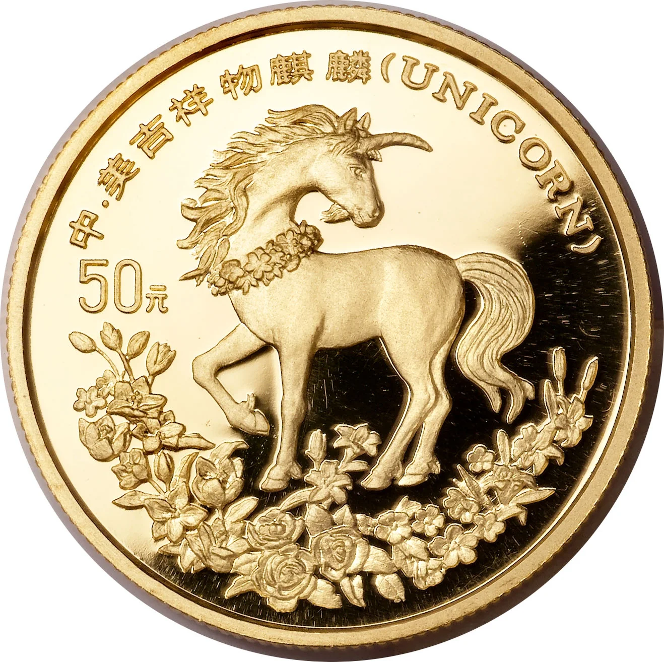 Unicorn facing right with rose sprays below, denomination at left.