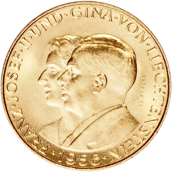 Franz Josef II and Princess Gina conjoined busts facing left, with date below and surrounding lettering.