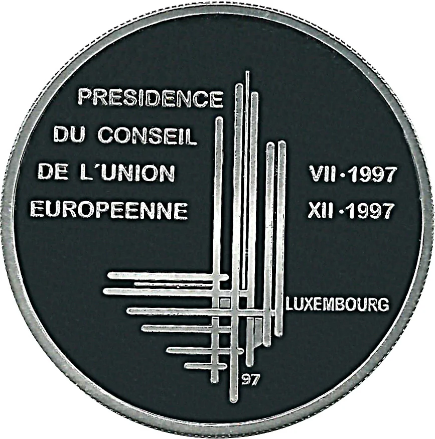 Description: On the reverse, the Luxembourg EU Presidency logo is centered, flanked by the legend on the left and the presidency dates on the right, with the issue date below.