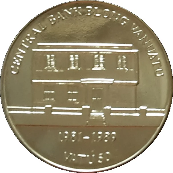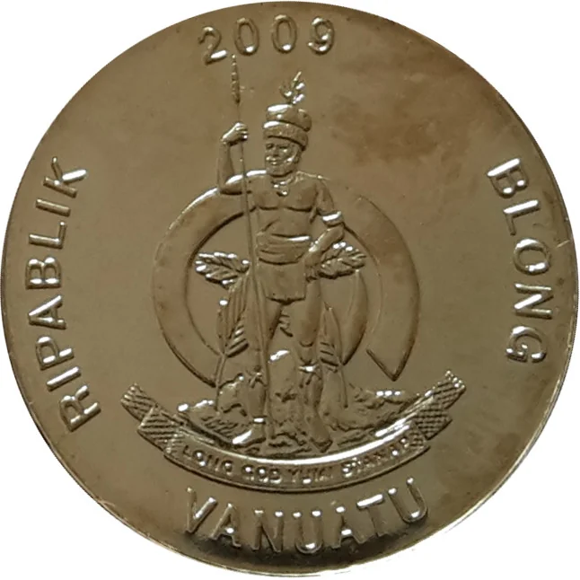 Vanuatu's arms depict a Melanesian warrior before a curved boar's tooth, a scroll reading "LONG GOD YUMI STANAP," and the date.