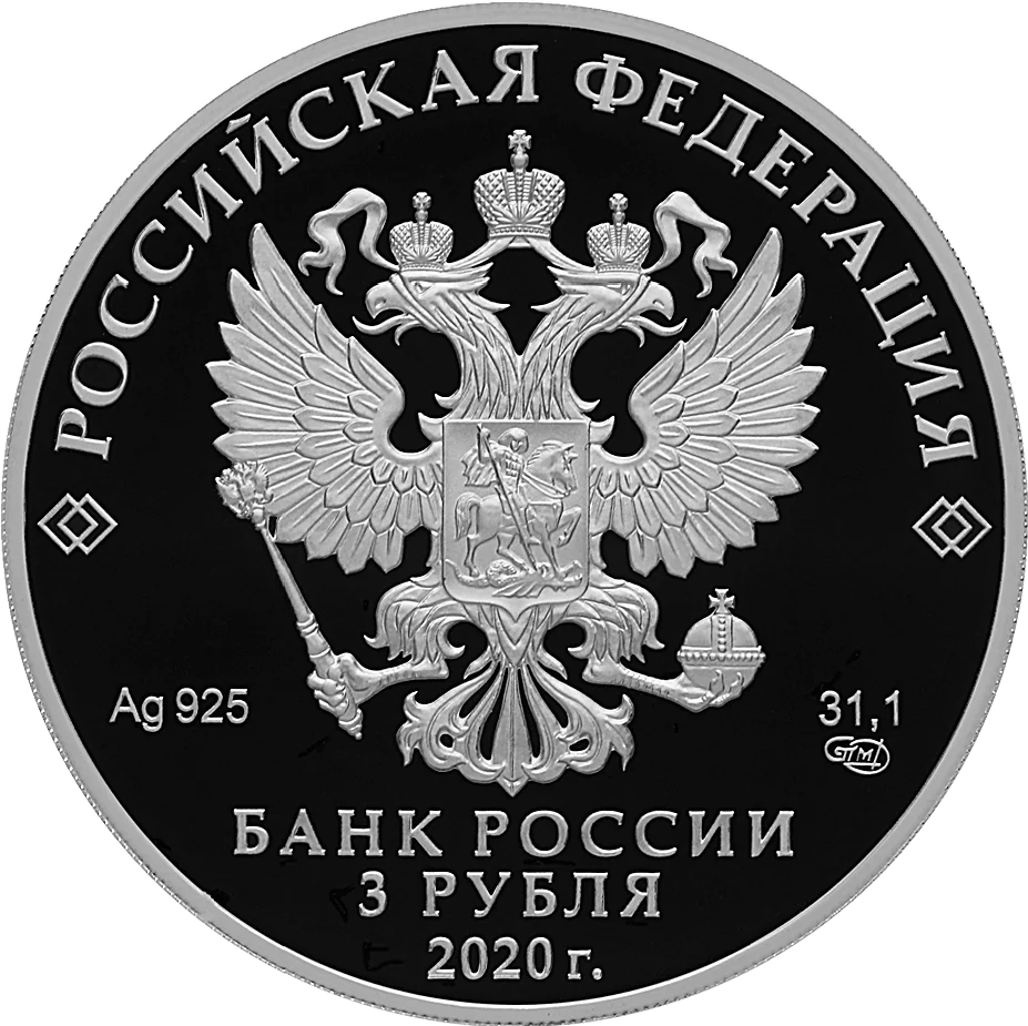 The obverse features the Russian Federation coat of arms with the inscription "РОССИЙСКАЯ ФЕДЕРАЦИЯ" above. Below are the metal specifications and mint mark, with "БАНК РОССИИ", "3 РУБЛЯ", and "2020 г." at the bottom.