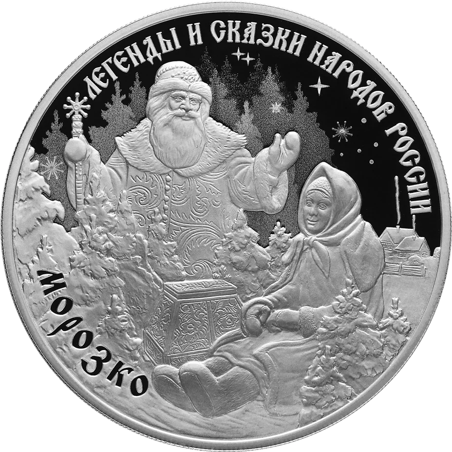 The disc's mirror field features a relief scene from the folktale 'Morozko' set against a stylized forest, stars, and snowflakes. The rim is inscribed with "LEGENDS AND FOLKTALES OF RUSSIA" at the top and "MOROZKO" at the bottom left.