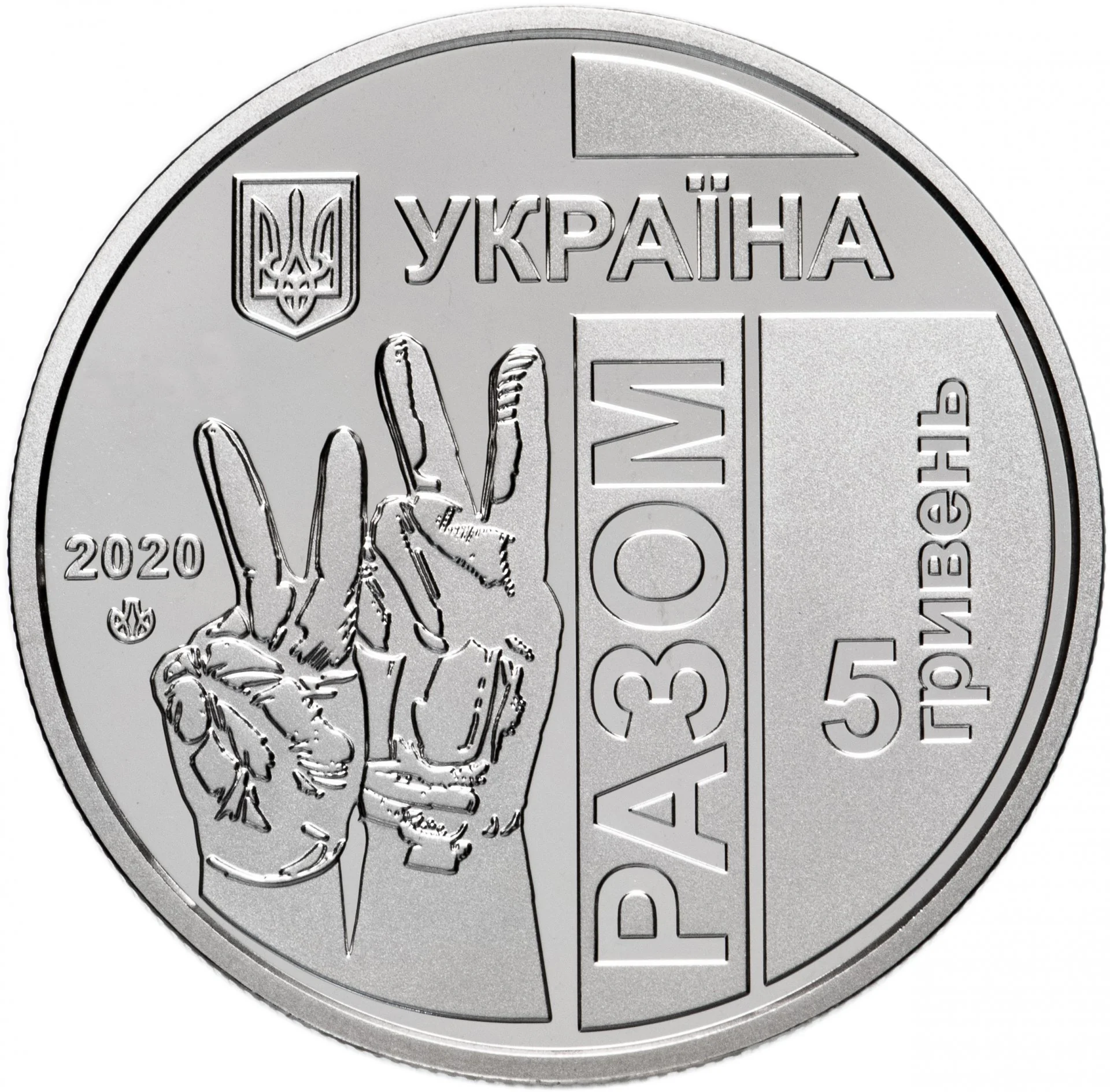 Description: The obverse features Ukraine's small coat of arms and "УКРАЇНА." On the right, against a matt background, is the vertical text "РАЗОМ" and "5/ГРИВЕНЬ." On the left, against a smooth background, are two hands forming a V for victory and peace, the year 2020, and the NBU mint mark.