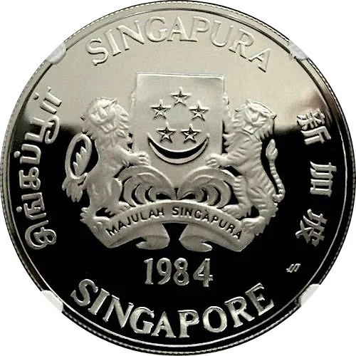 The obverse shows Singapore's coat of arms with the issue year below. The word "SINGAPORE" appears along the border in the four official languages: Malay, Mandarin, English, and Tamil.