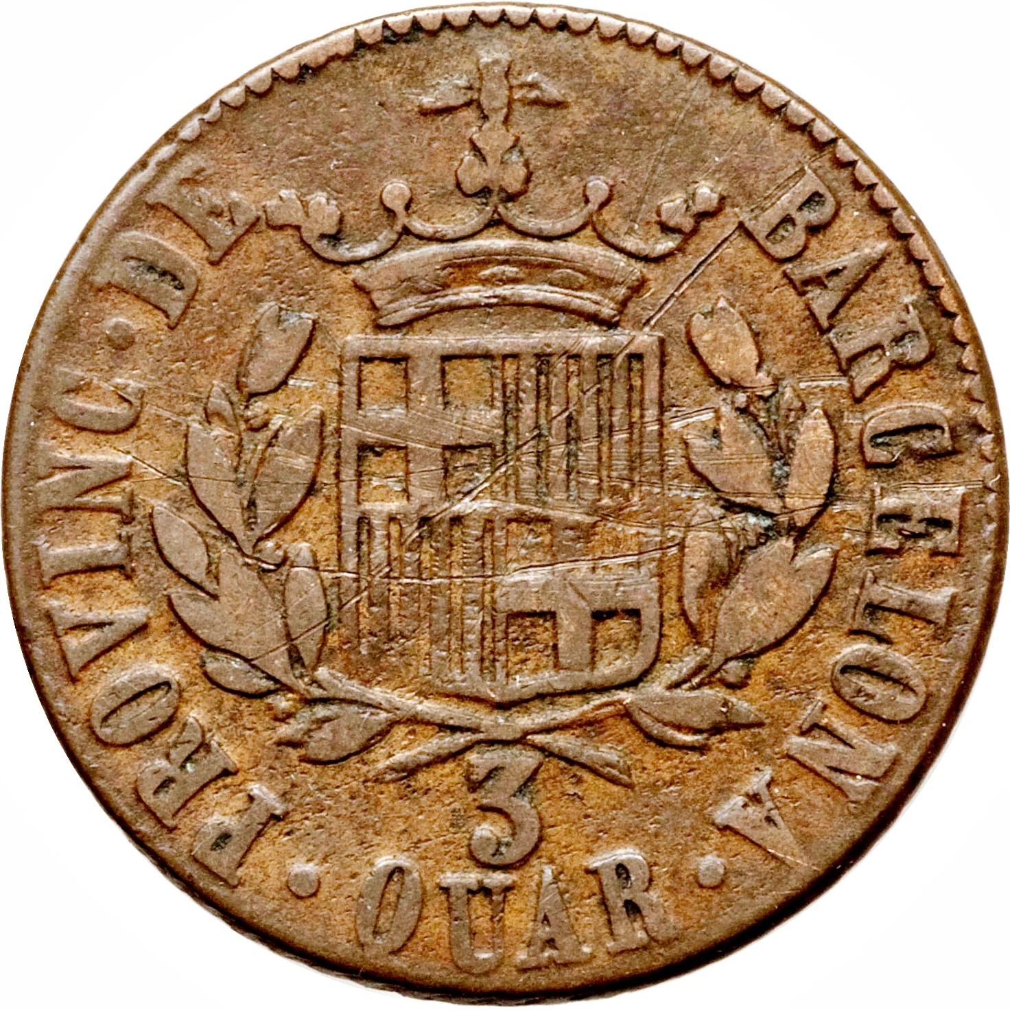 Barcelona crowned coat of arms above value, surrounded by legend.