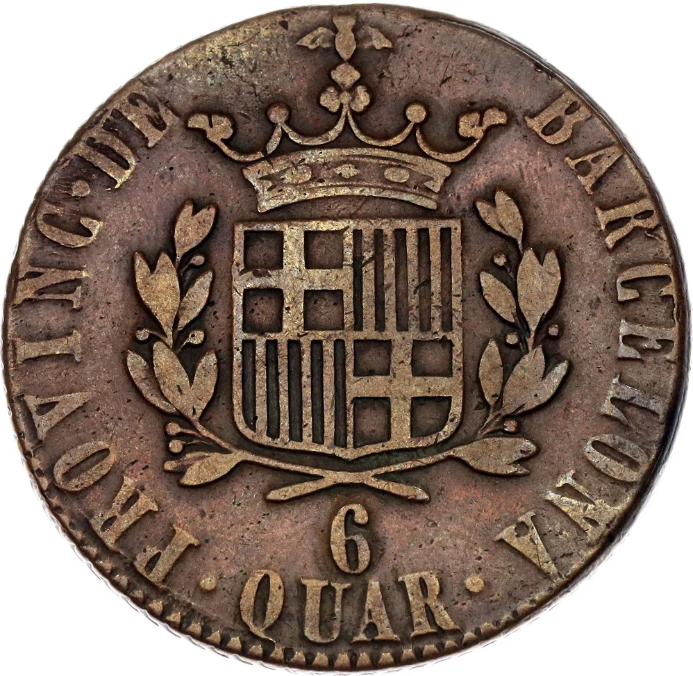 Barcelona crowned coat of arms above value, surrounded by legend.