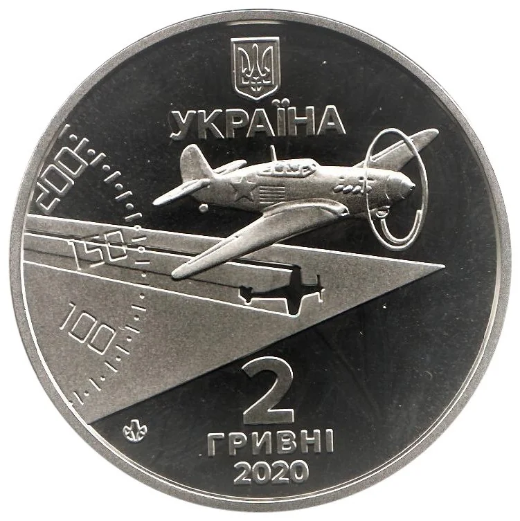 Ukraine’s small coat of arms above the word УКРАЇНА. A stylized WWII air fight shows a plane above the outline of a shot-down enemy. Below is "2/ГРИВНІ/2020" and the NBU mint mark.