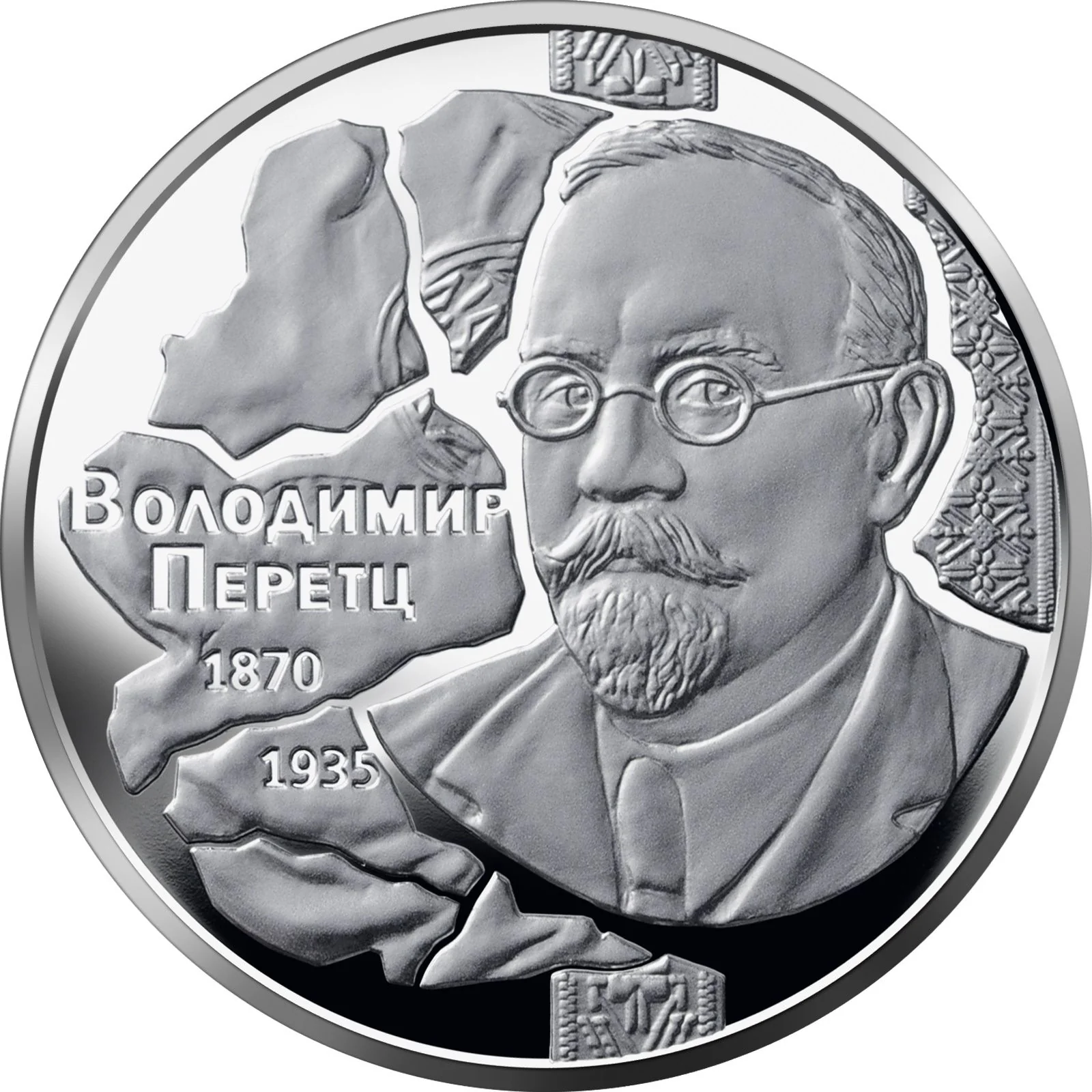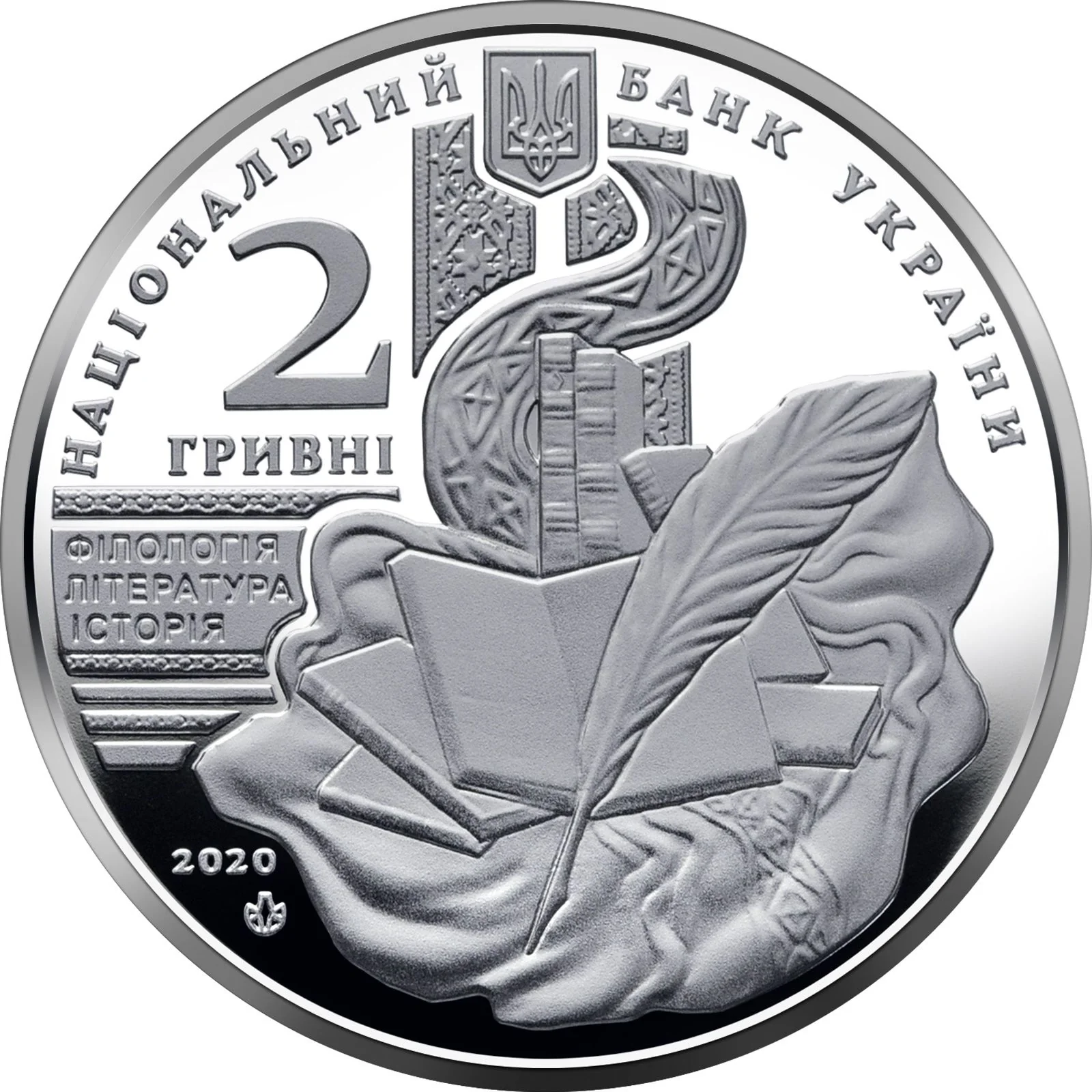 Description: The obverse features Ukraine's small coat of arms and the inscription "NATIONAL BANK OF UKRAINE." It shows the face value "2 HRYVNIAS" and a stylized composition of books and a quill pen representing Volodymyr Perets's work in philology, literature, and history. The 2020 issue year and mint mark are also present.