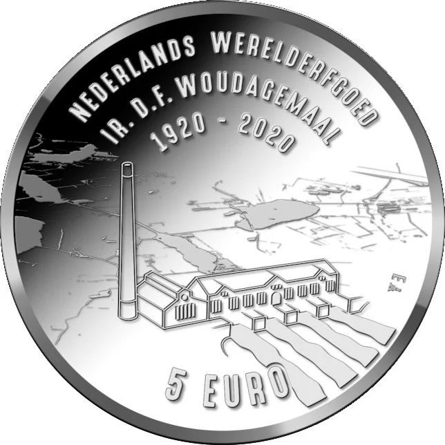 The first coin to feature King Willem-Alexander with a beard, this commemorative 5 Euro piece is a historic and sought-after Dutch coin. Its obverse shows the king's portrait before the waving flag of Friesland, above a segment of the Woudagemaal's canals.