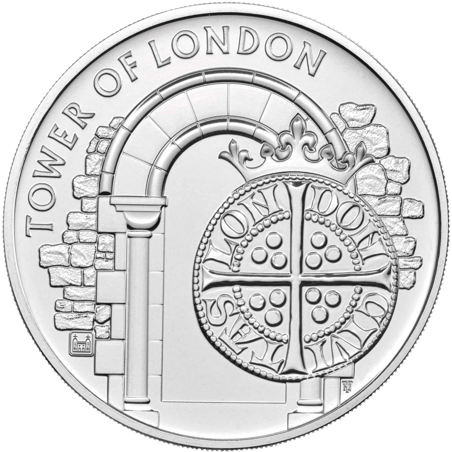 Crowned medieval penny before a Roman arch window, Tower of London mint mark at left.