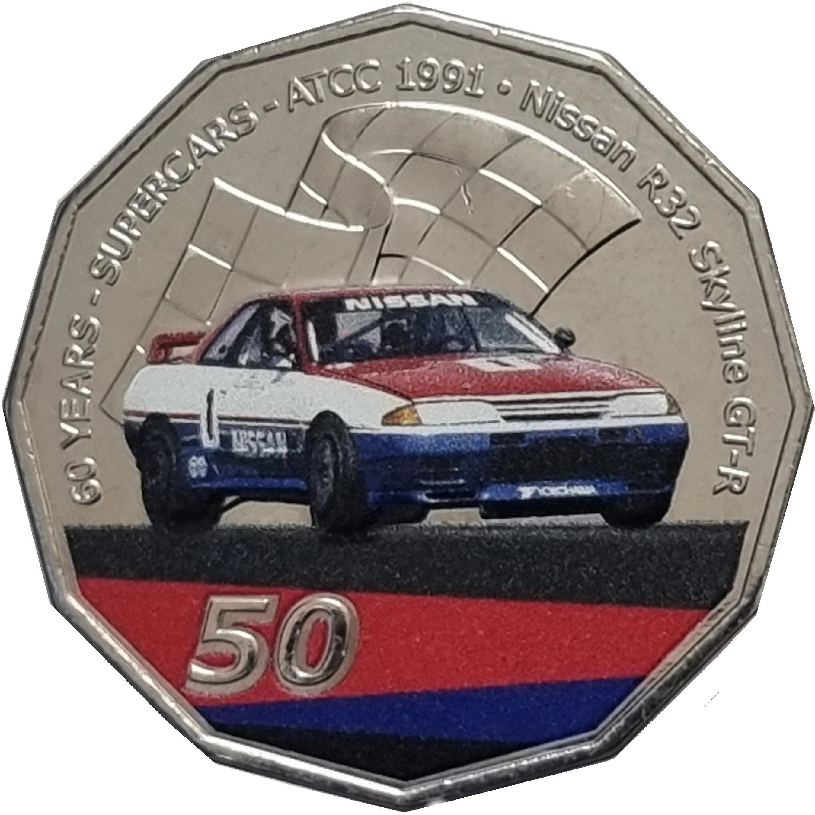 Red, white, and blue Nissan R32 GT-R before a checkered flag.